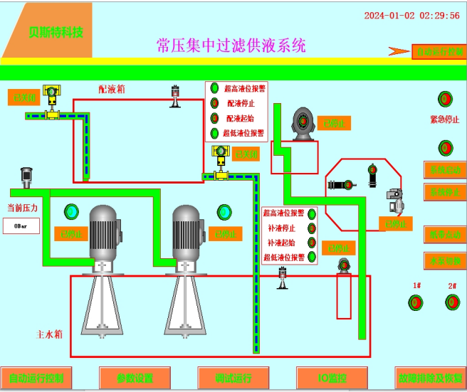 1、手動模式用于對系統(tǒng)各個部件進行調試,可以對過濾機、磁分、油分、水泵、配液電動閥、加液電動閥進行開關控制