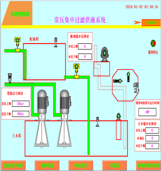 1、參數(shù)設置界面可以對配液箱高低液位進行設置,低液位(設置范圍100-200應高于液位浮球的最低位)時配液閥打開帶動比例泵啟動,高液位(設置范圍700-850應低于液位浮球的最高位)時配液閥關閉
